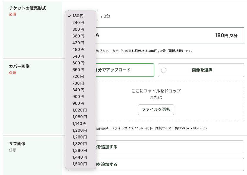 設定できる販売価格は「180円/3分 〜 1,500円/3分」です。