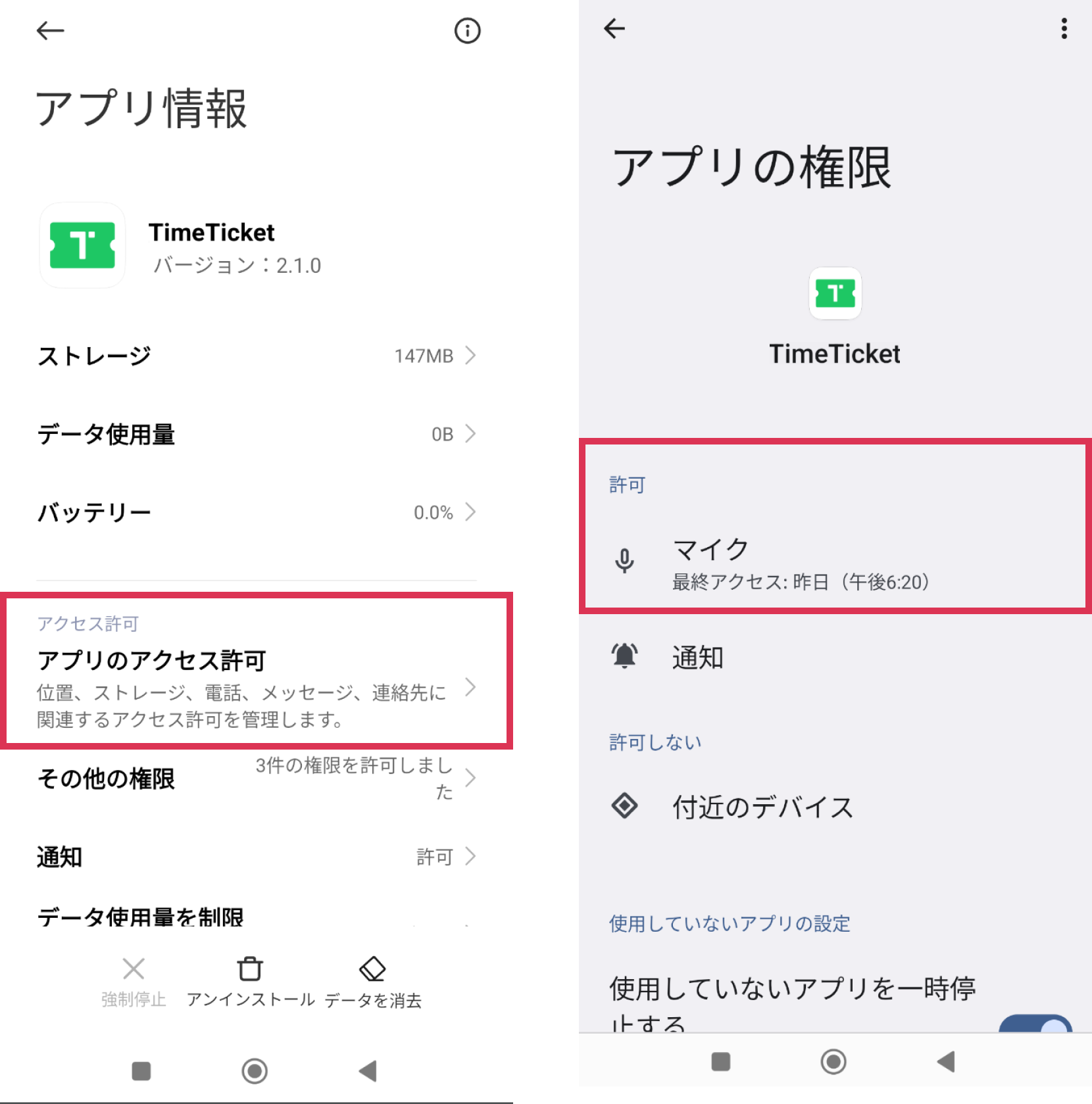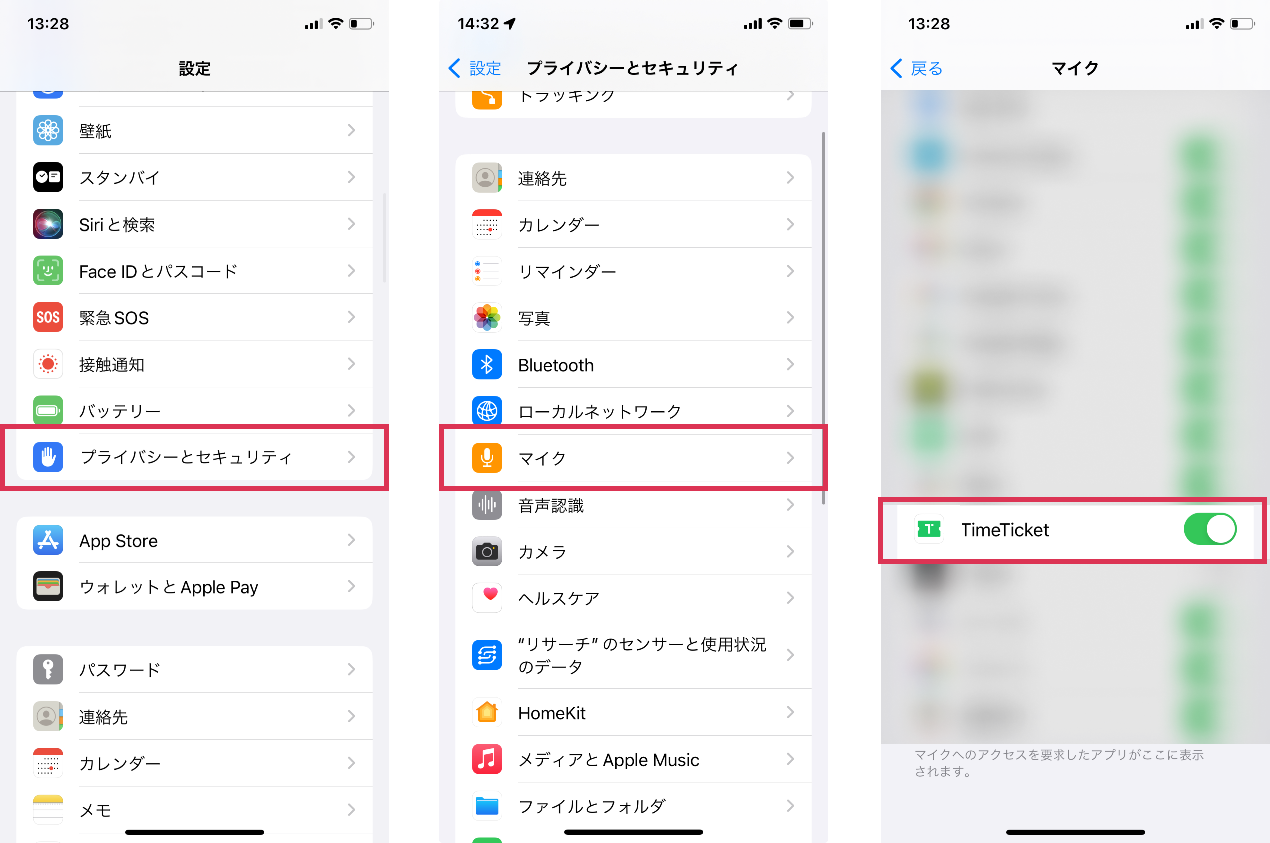 通話を行うにはタイムチケットアプリに対して「マイクへのアクセス」または「音声の録音」を許可する必要があります。