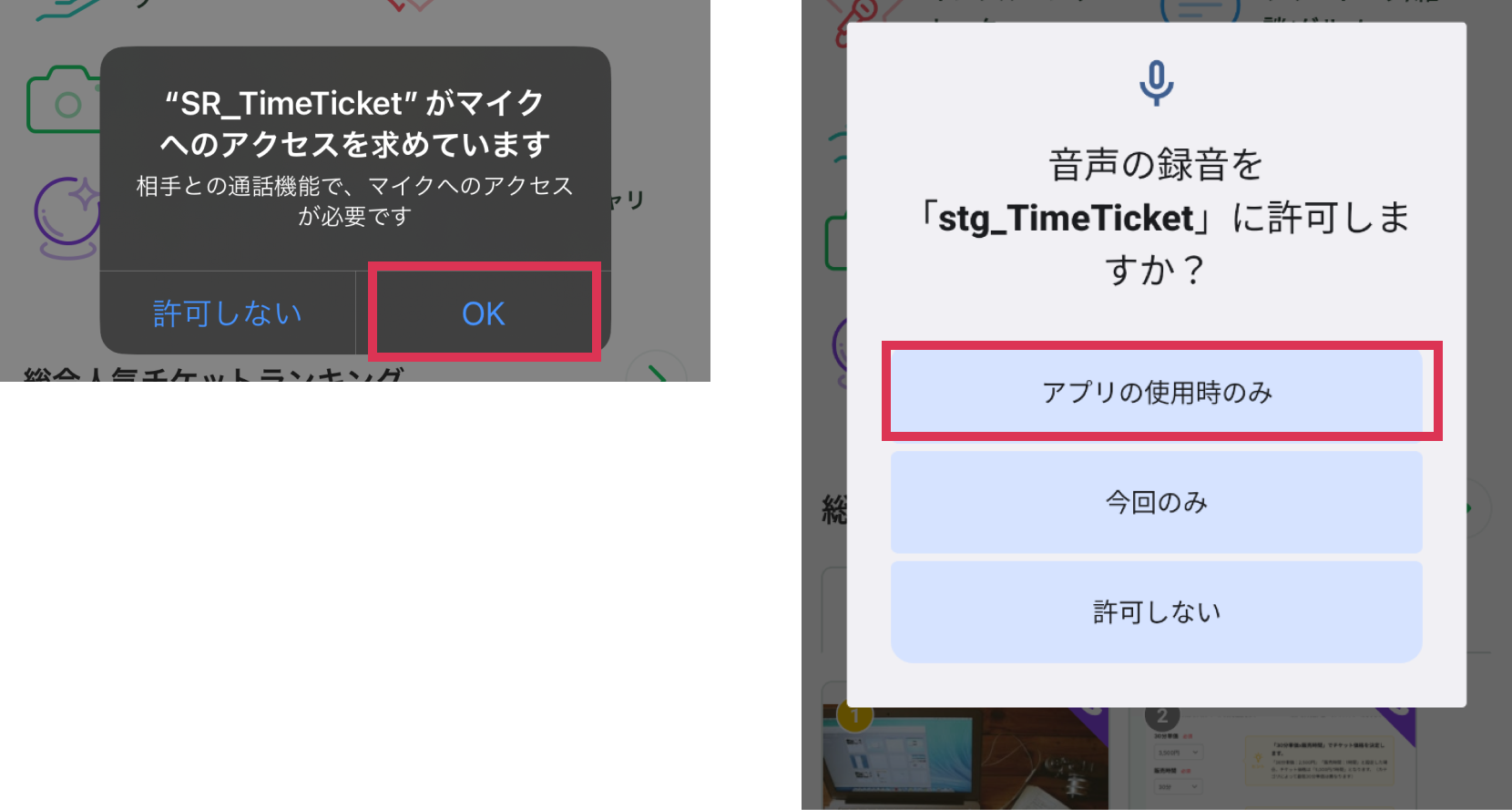 タイムチケットアプリの初回起動時、電話相談チケットの購入時に以下の許可設定ダイアログが表示されますので許可をしてください。