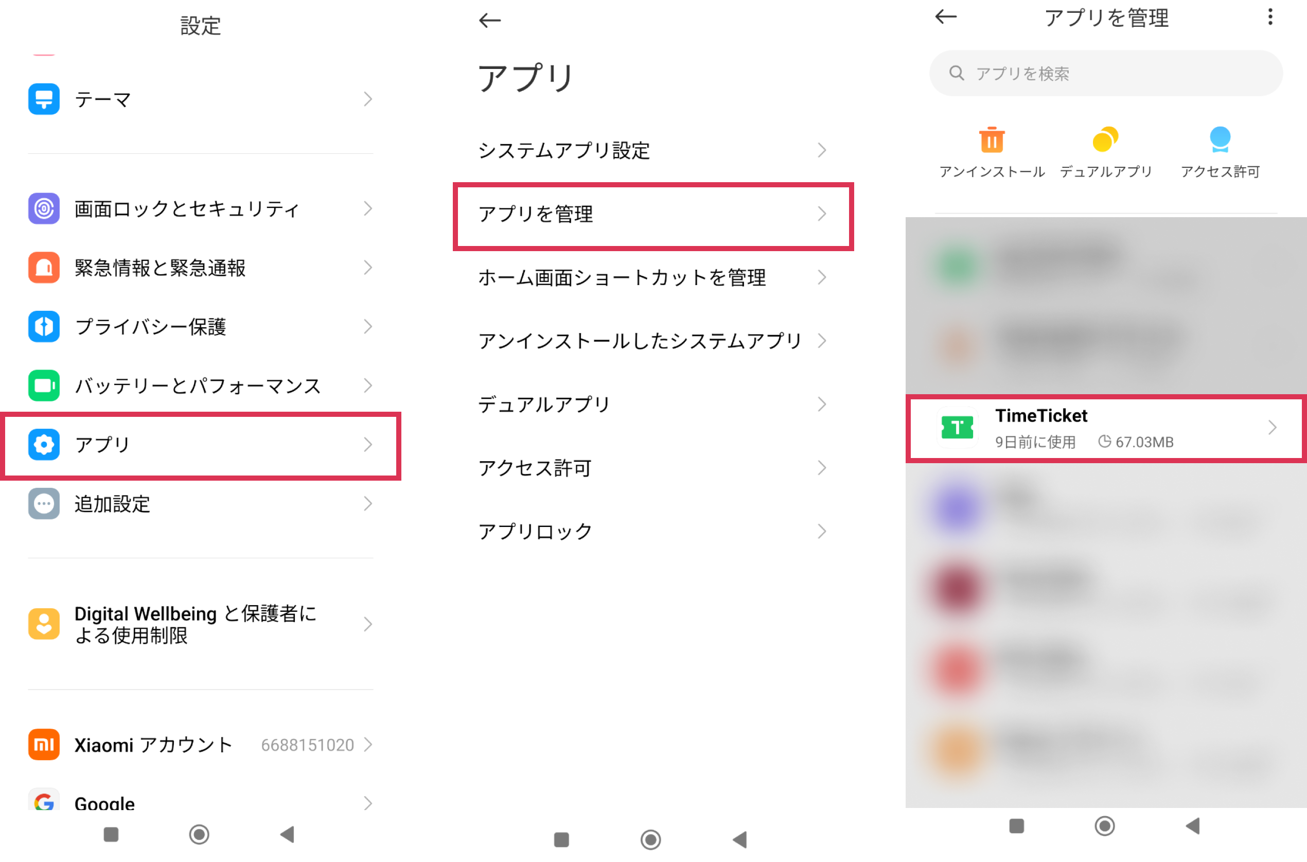 ①まず「設定 > アプリ > アプリを管理 から「TimeTicket」を選択してください。
