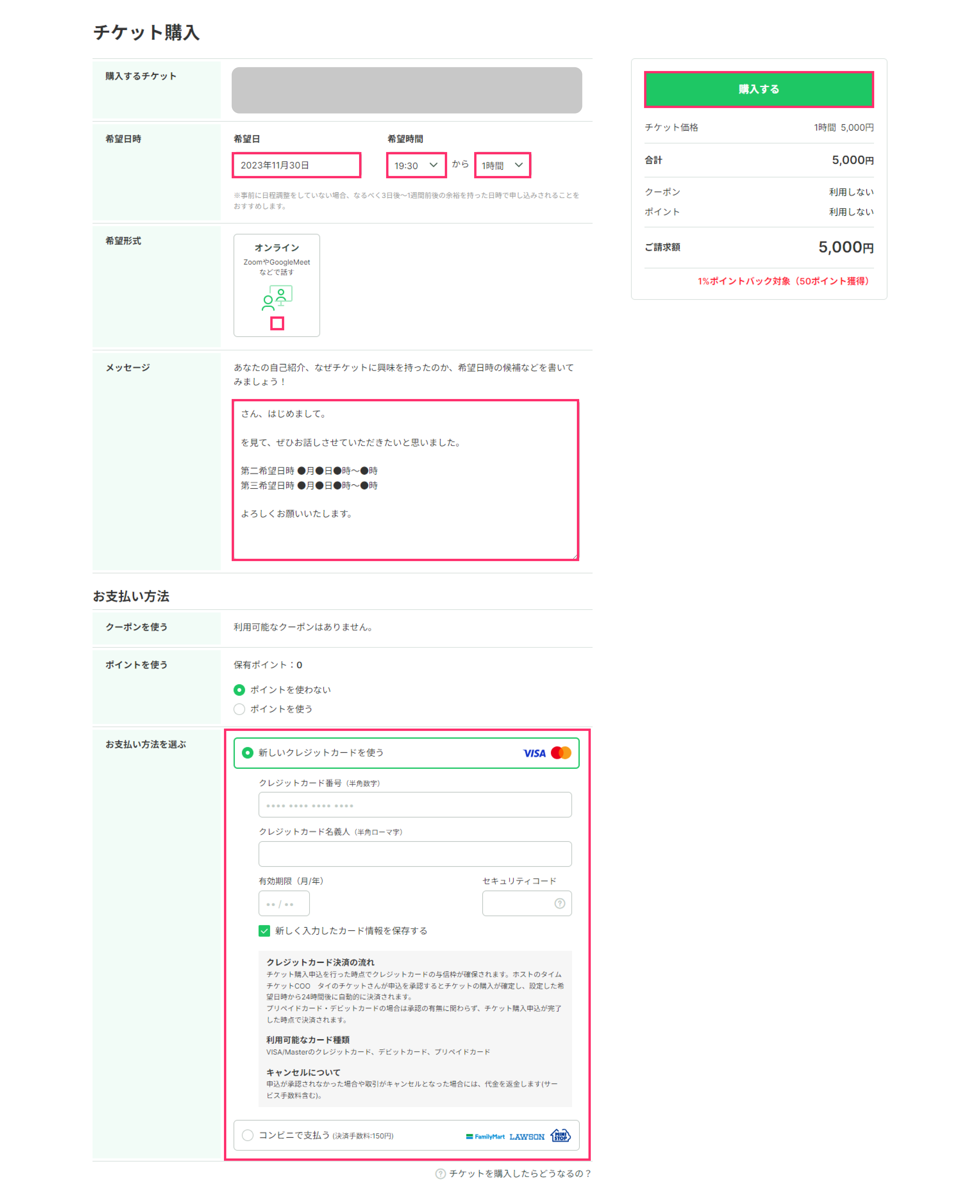 「チケットを買うときの取引の流れ > ③希望日時を指定して購入申込みする」