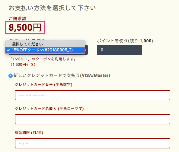 購入申込画面で、「クーポンを使う」から利用するクーポンを選択します(クーポンが利用できない場合は表示されません)。