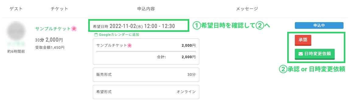 日時変更の流れは「ホストからゲストへの日時変更依頼の送り方(販売者→購入者)」をご確認ください。